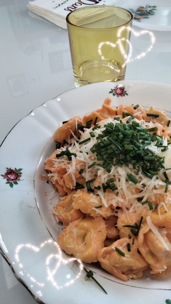 J’adore ma vaisselle vintage 🍽️ et la ciboulette du jardin sur mes pâtes 🍝I love my vintage dishware and the fresh chives on top of my pasta 🤩
