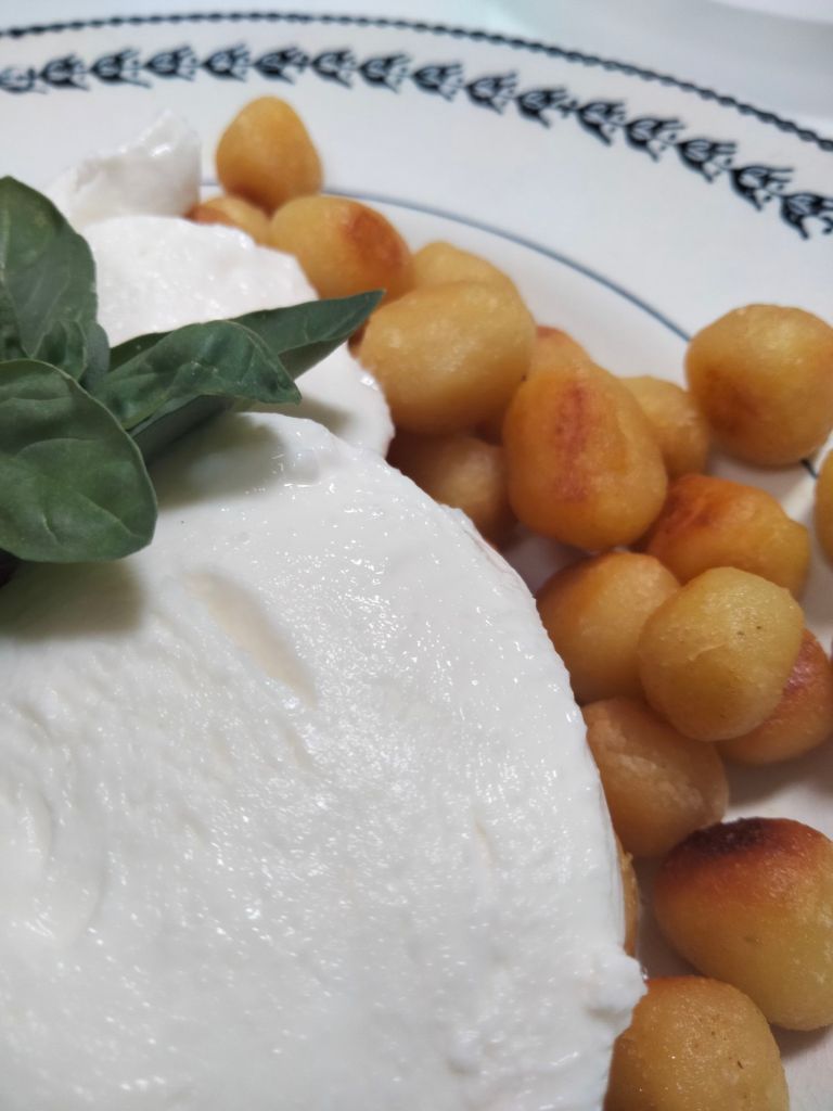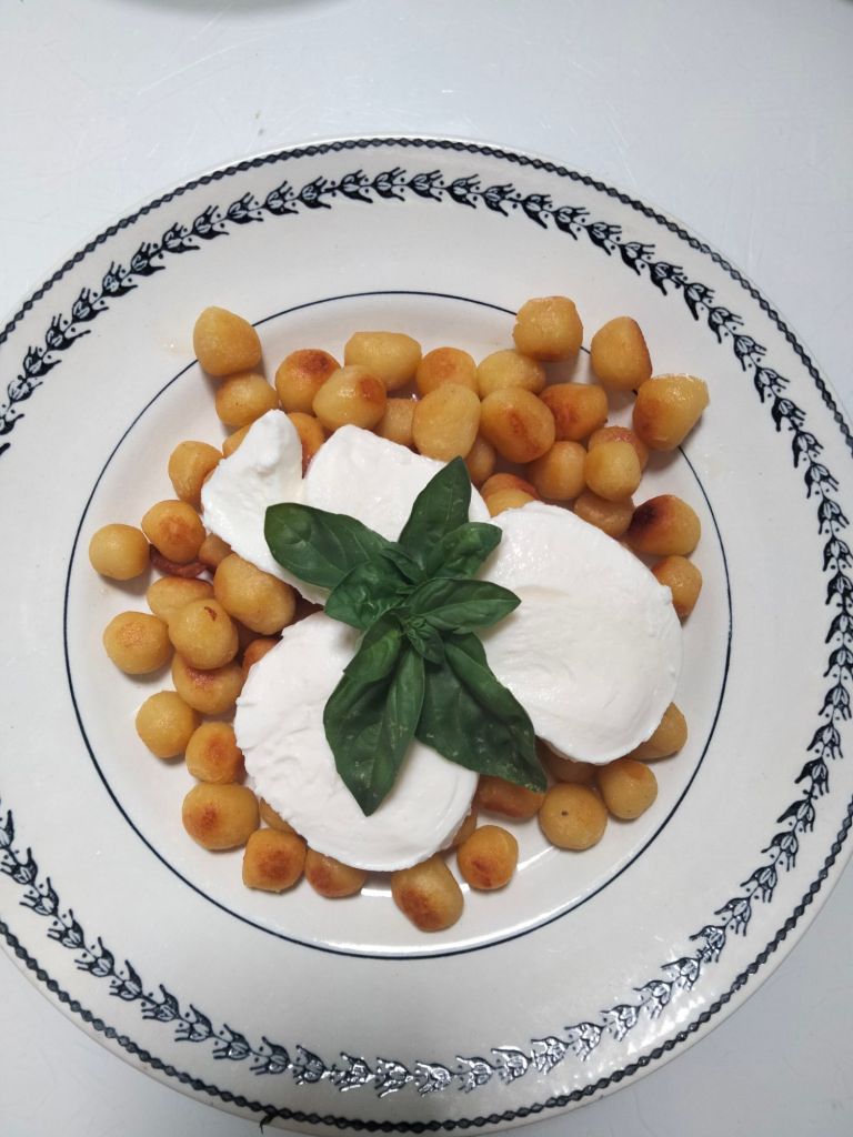 Des gnocchis tout petits, de la mozzarella et du basilic du jardin 😀 very small gnocchi with mozzarella cheese and basil from the garden