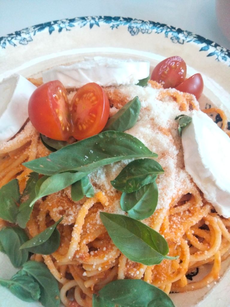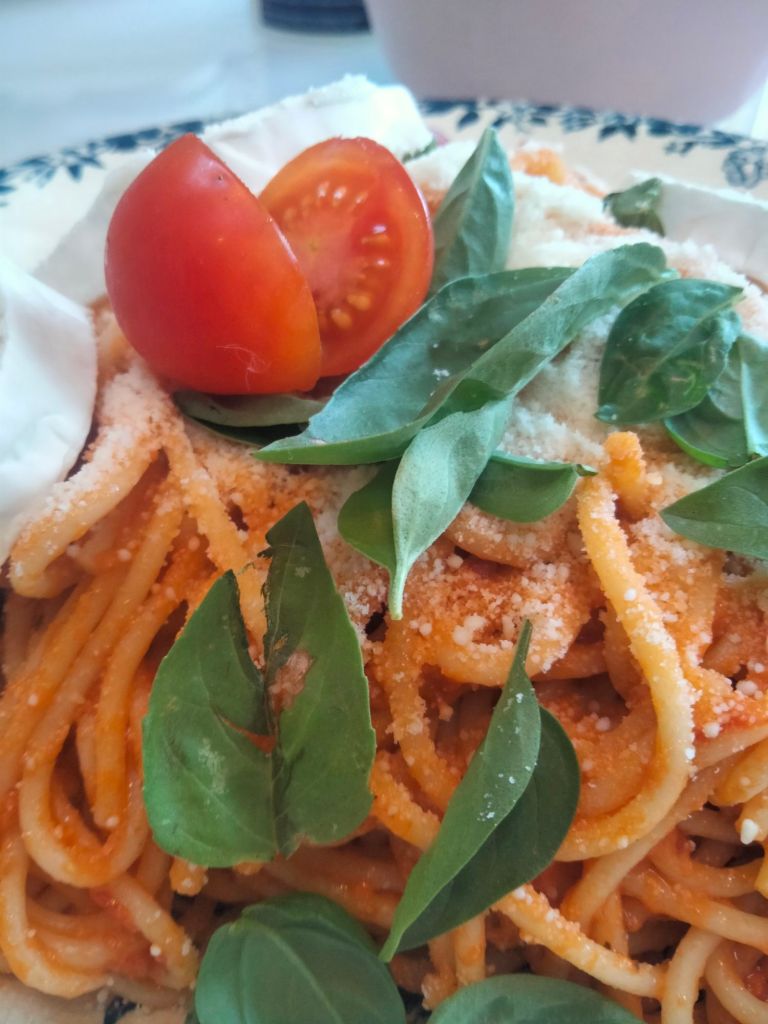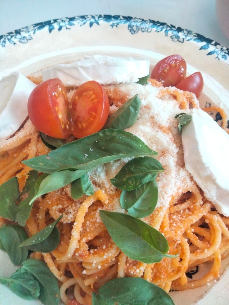 Plaisir simple : des pĂątes avec de la sauce tomate maison avec les tomates du jardin ! Basilic, tomates cerises et chĂšvre