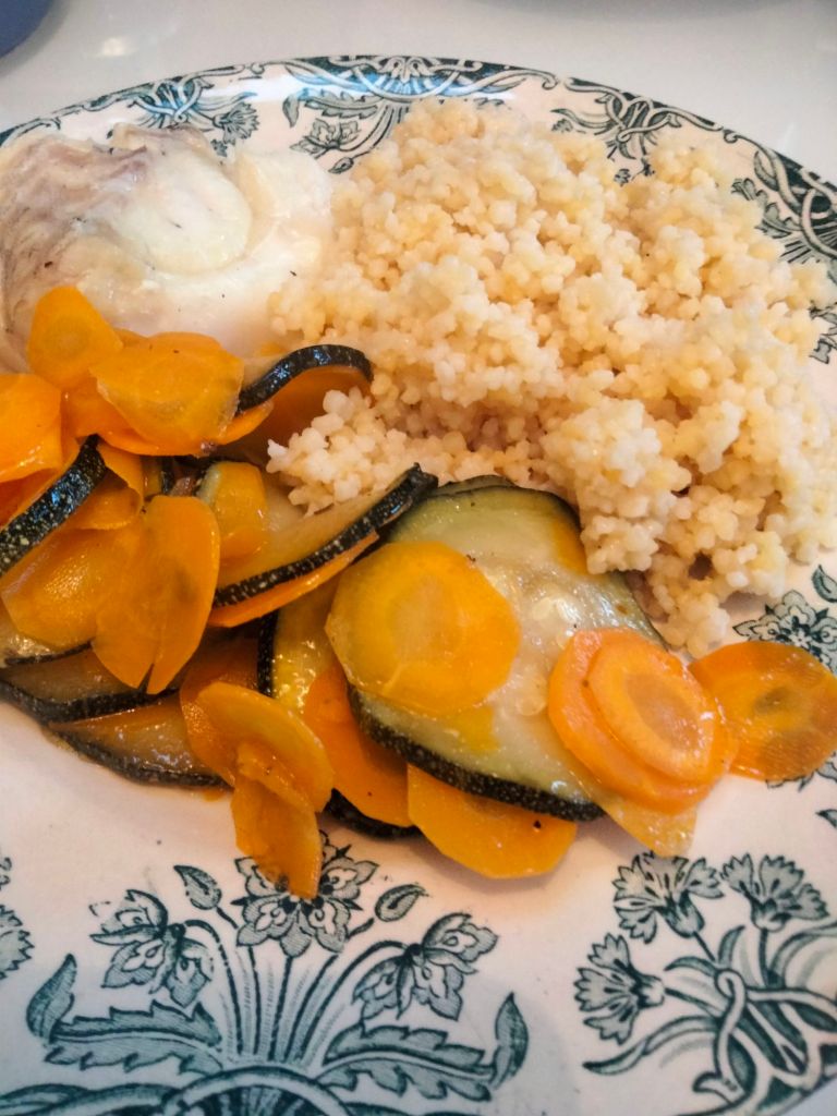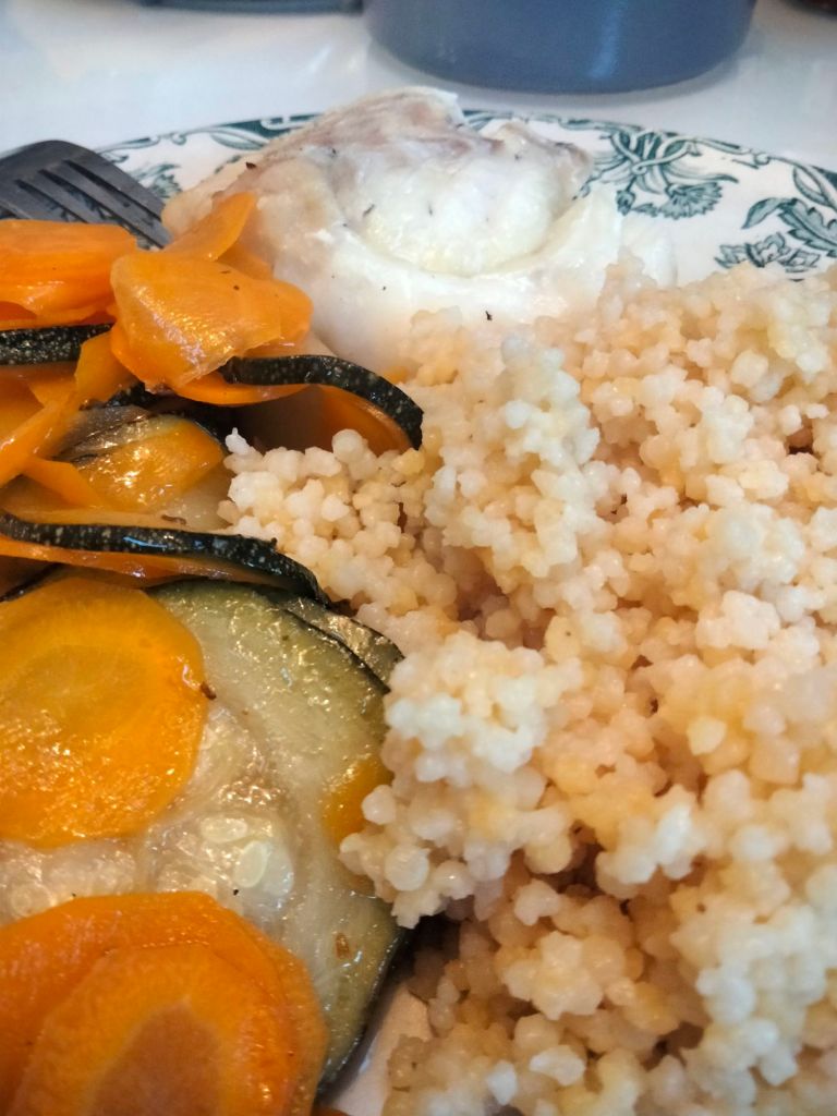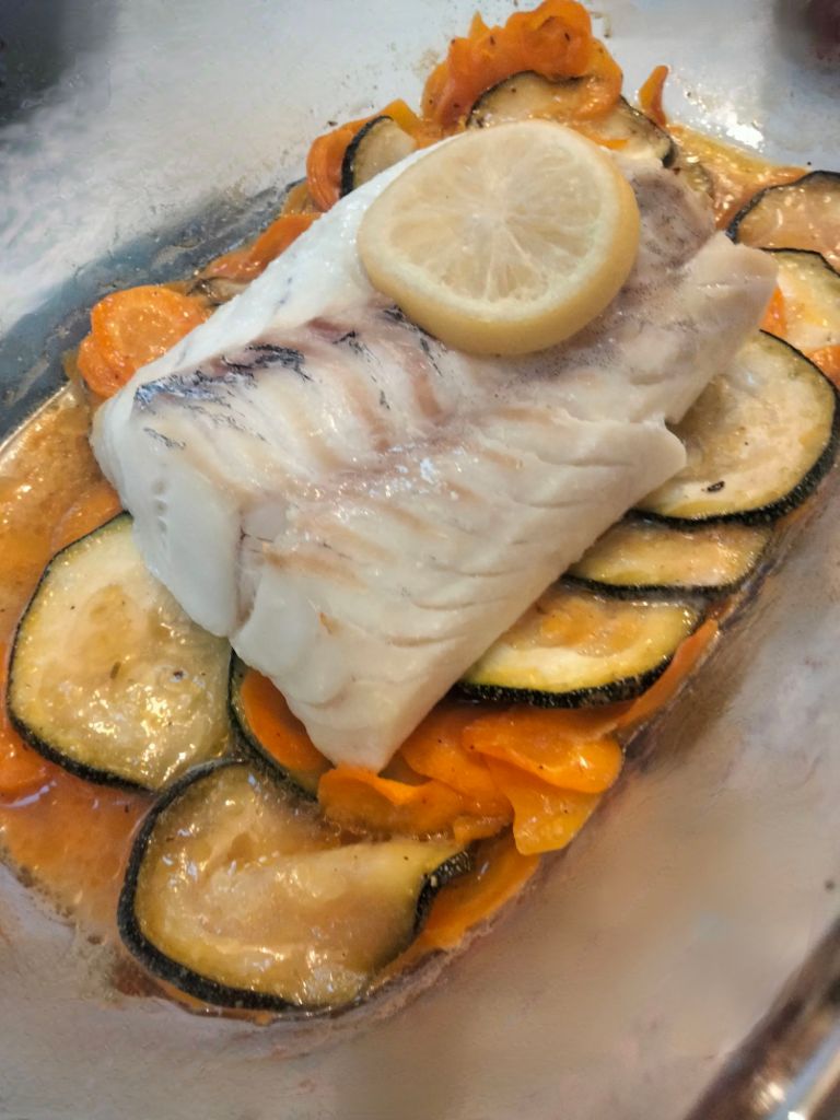 Courgettes et carottes du jardin en rondelles, sel, poivre, huile d’olive, jus de citron et un peu de miel. Au four préchauffé à 180 pendant 20 minutes en mélangeant de temps en temps et puis on ajoute le dos de cabillaud et retour dans le four pour 15 minutes. 🥕🥒🧂🍋🍯🐟 Sliced zucchini and carrots from the garden, salt, pepper, olive oil, lemon juice and a bit of honey. 20 minutes in pre heated oven at 180, stir occasionally then add cod and back in the oven for 15 minutes. 🥕🥒🧂🍋🍯🐟