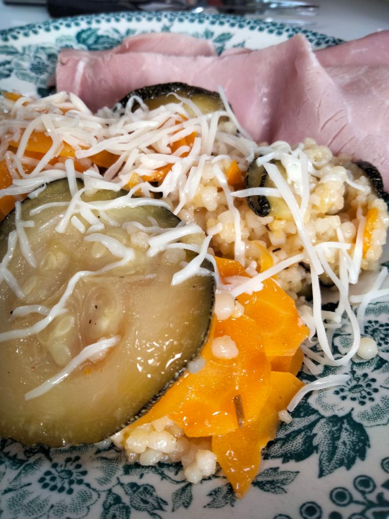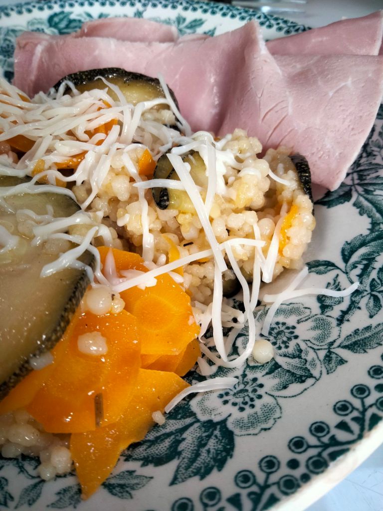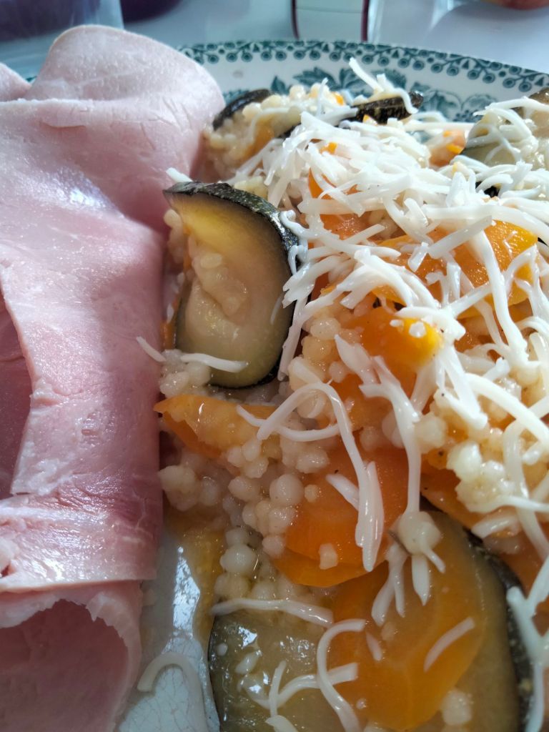 Courgettes et carottes du jardin avec des tendres perles et du jambon blanc, on reprend en mains son alimentation 😂mais bon, un peu de gruyère quand même, ça ne fait pas de mal 😂
