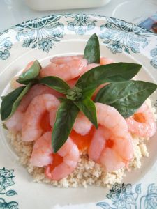 Pour le repas du midi, quelque chose de simple : semoule, crevettes, de la sauce aigre-douce et du basilic du jardin 🦐🦐🦐 Something easy for lunch: semolina, shrimps, sweet and sour sauce and basil from the garden 🦐🦐🦐