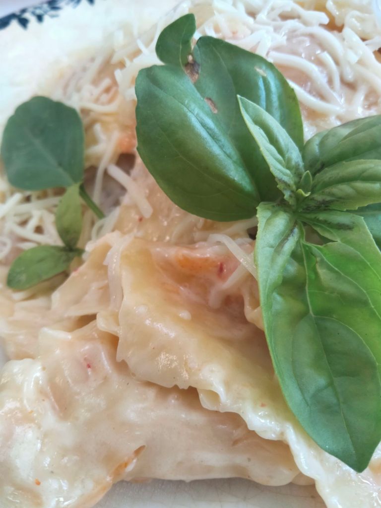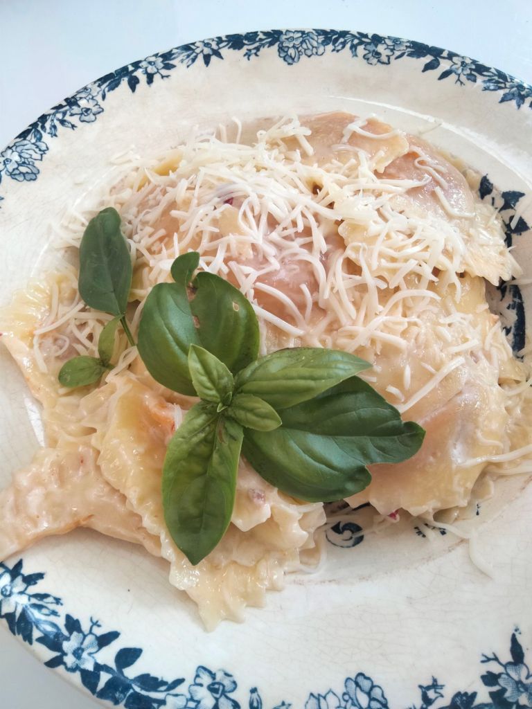 À la viande accompagnées de gruyère, crème et basilic. Je mange toujours dans une jolie assiette, c’est meilleur 😋 stuffed with meat and served with gruyère, sour cream and basil. I always eat on a nice plate, it tastes better 😋