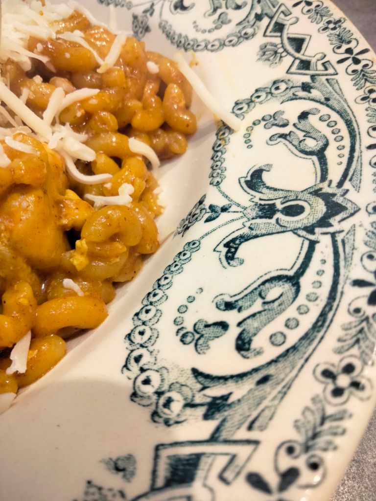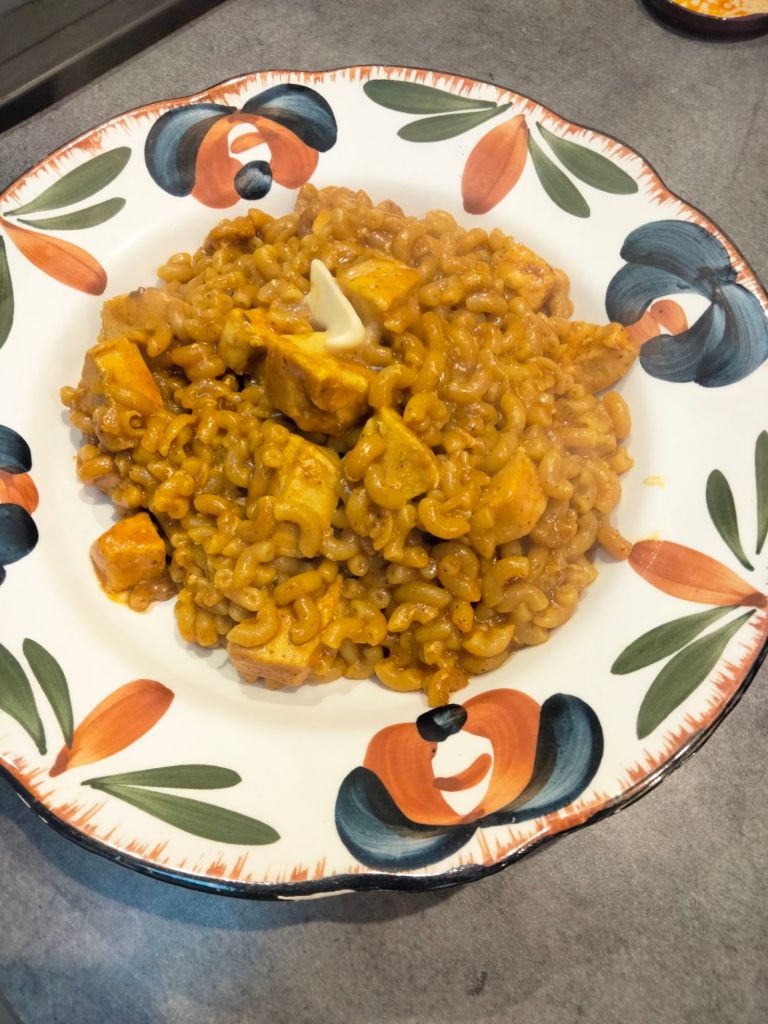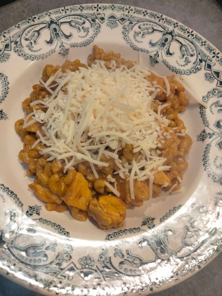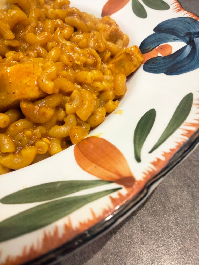 I wasn’t necessarily convinced by the idea of mixing chicken, Indian sauce, and coquillettes pasta, but sometimes you have to make do with what you have!