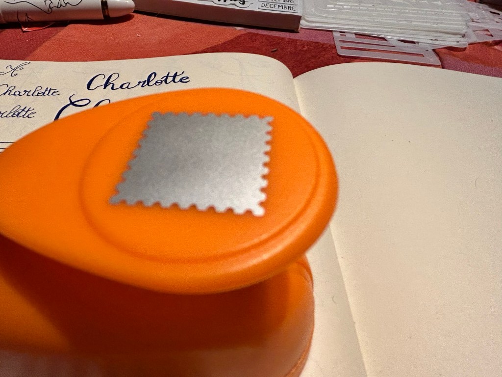 Alors j’ai acheté cette perforatrice en forme de petit timbre et je vais essayer de coller un timbre par jour de quelque chose qui aura compté dans ma journée. Ici les dates sont bien trop grandes mais c’est pour m’entraîner à faire de jolies lettres.