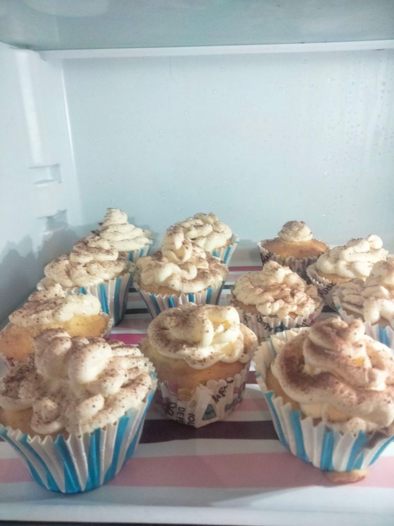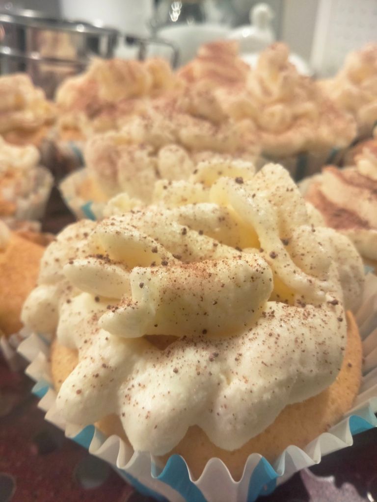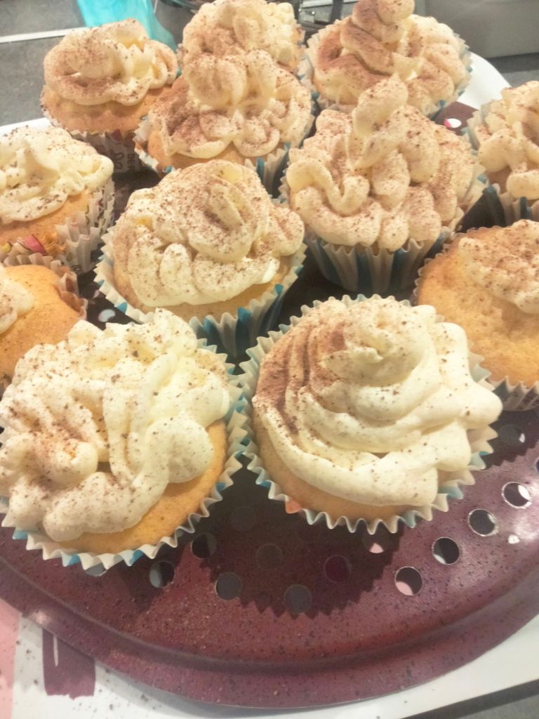 Un dessert tout en douceur avec ses muffins surmontés d’une crème légère au mascarpone et saupoudré de chocolat en poudre. Dans certains j’ai mis une ou deux framboises (surgelées 😉) pour voir ce que ça donne et ma foi, c’est plutôt bon. On s’est régalé ! Pour la recette je suis partie sur la base d’un gâteau au yaourt tout simplement.