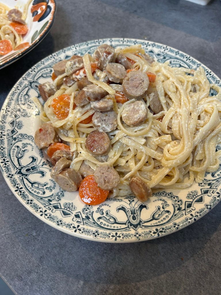 Les restes c’est la vie 😂 Alors hop on met dans la sauteuse la saucisse coupée en morceaux, les rondelles de carottes, du sel, du poivre, du thym; on ajoute les pâtes et de la crème fraiche entière (la crème c’est la vie aussi😂) et on obtient un repas facile, économique et bon !