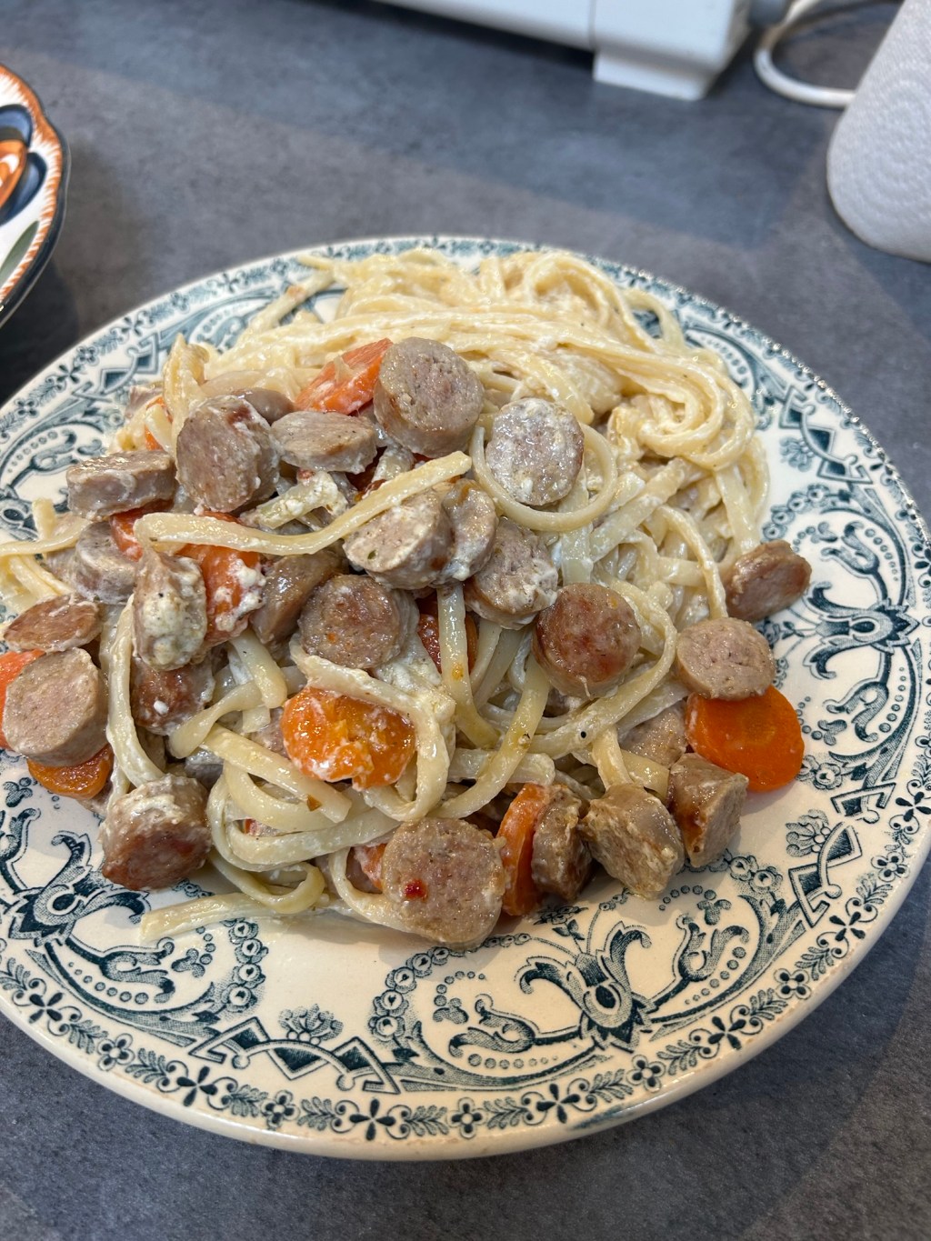 Leftovers are life 😂 So, toss the chopped sausage, carrot slices, salt, pepper, and thyme into the frying pan; add the pasta and whole cream (cream is life too 😂) and you’ve got an easy, economical, and delicious meal!