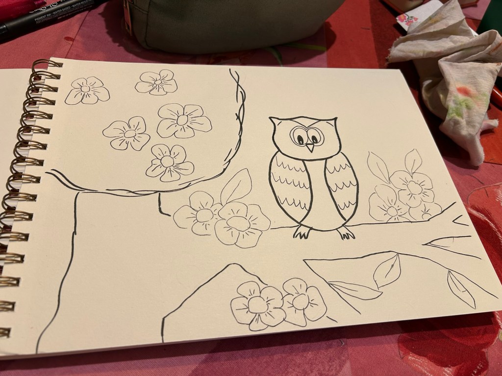 Sur le carnet de dessin que m’a offert Virgile, il y a des chouettes sur la couverture alors je me suis dit que j’allais inaugurer ce carnet avec une chouette đ