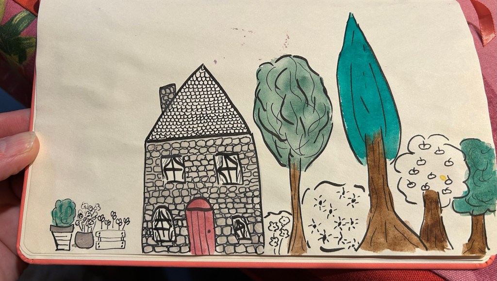 Le deuxième est le plus pragmatique: le projet qui demande pas mal de temps et d’énergie, c’est l’achat d’une nouvelle maison! Bientôt je ne serai plus locataire et je me lance en solo dans l’aventure de la propriété et des gros travaux 😮 et je me rends compte que j’ai eu envie de dessiner une maison 😂